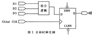 全 局时钟或同步时钟是最简单、可靠的时钟。在FPGA设计中时钟的最好解决方案是:由专用的全局时钟输入引脚驱动的单个主时钟去钟控设计中的每一个时序器 件,只要有可能就应尽量在设计项目中采用全局时钟。FPGA都具有专门的全局时钟引脚,它直接连到器件中的每一个寄存器。在器件中,这种全局时钟能提供最 短的时钟延时(数据输入到数据到达输出的时间)。图2是全局时钟的一个实例。