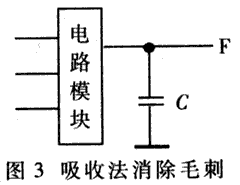 增加输出滤波,在输出端接上小电容C可以滤除毛刺,如图3所示。但输出波形的前后沿将变坏,在对波形要求较严格时,应再加整形电路,该方法不宜在中间级使用。
