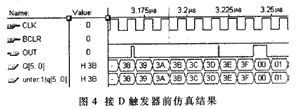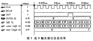 当计数器的输出进行相"与"或相"或"时会产生毛刺。随着计数器位数的增加,毛刺的数量和毛刺的种类也会越来越复杂。毛刺在计数器电路输出中的仿真结果如图4所示,从图中可发现有毛刺出现。此时,可通过在输出端加D触发器加以消除。接D触发器后仿真结果如图5所示。