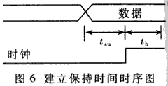 异 步电路主要是组合逻辑电路,用于产生地址译码器、FIFO或RAM的读写控制信号脉冲,其逻辑输出与任何时钟信号都没有关系,译码输出产生的毛刺通常是可 以监控的。同步电路是由时序电路(寄存器和各种触发器)和组合逻辑电路构成的电路,其所有操作都是在严格的时钟控制下完成的。这些时序电路共享同一个时钟 CLK,而所有的状态变化都是在时钟的上升沿(或下降沿)完成的。比如D触发器,当上升延到来时,寄存器把D端的电平传到Q输出端。 下面介绍一下建立保 持时间的问题。建立时间(tsu)是指在触发器的时钟上升沿到来以前,数据稳定不变的时间。如果建立时间不够,数据将不能在这个时钟上升沿被打入触发器; 保持时间(th)是指在触发器的时钟上升沿到来以后,数据稳定不变的时间。如果保持时间不够,数据同样不能被打入触发器。数据稳定传输必须满足建立时间和 保持时间的要求,否则电路就会出现逻辑错误。建立保持时间时序图如图6所示。