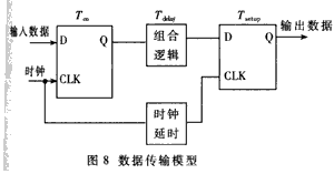 同步电路的速度是指同步系统时钟的速度,同步时钟愈快,电路处理数据的时间间隔越短,电路在单位时间内处理的数据量就愈大。在讨论同步电路的运行速度之前,先看看电路的数据传输模型,如图8所示。