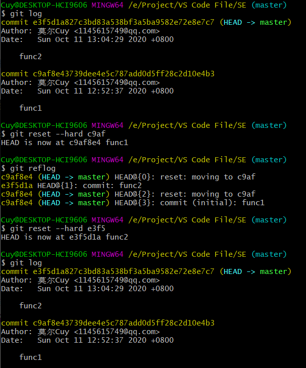 在git log中commit message的存在能让我们清晰得认识到每个commit id所对应的版本,因此在进行版本回退的时候,用commit id进行版本回退的标识还是非常清晰明了的,个人推荐使用这种方式。