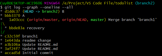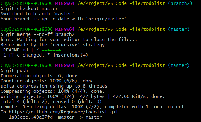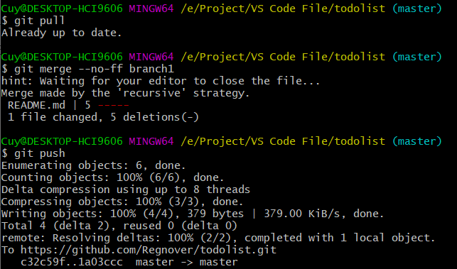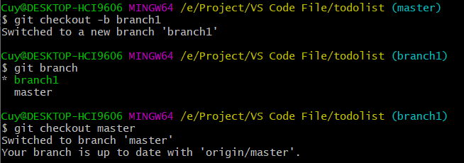 在VS Code中branch1分支下修改代码,执行git add和git commit命令,然后在命令行工具中master分支下pull远程master分支代码同步最新到本地存储库,合并branch1分支以及删除分支: