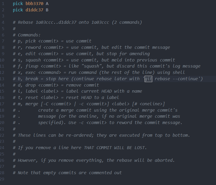 执行rebase命令时会弹出编辑器如下,选择删除A版本即直接删除"pick bbb3370 A "一行,然后保存退出: