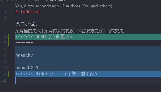 可以看到命令行窗口显示有合并冲突,打开冲突文件选择保留传入的更改解决冲突: