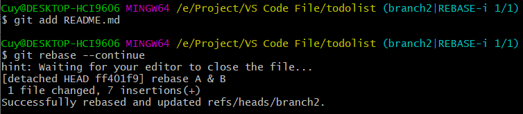 然后用git add命令将修改后的文件存入暂存区,继续执行rebase命令,修改commit message,最后push到github上的远程存储库中: