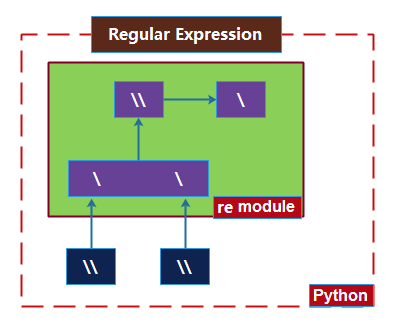 分析:代码是在Python的解释器中进行解释的,现在在python解释器引用re模块来使用正则表达式,re里面封装了语法规范,re中的\是有特殊功能的,所以在re里要使用\\来匹配一个\,但是第一步是使用python解释器来解释的,在python里的\也是有特殊意义的,在re本来使用\\来解释,在python里还要每个\使用两个\\来解释,所以在python解释器时使用4个\\\\\来解释一个\