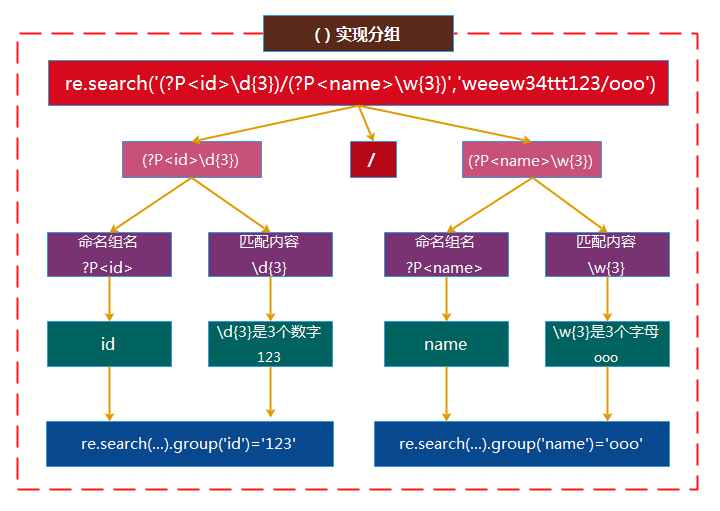 描述:(?P<id>\d{3})一个括号代表一个整体分组,?P固定写法给组命名,<>存放组的名字,\d{3}就是匹配的内容,\d{3}是匹配3个数字,这3个数的名字是id,\w{3}三个字母的名字是name
