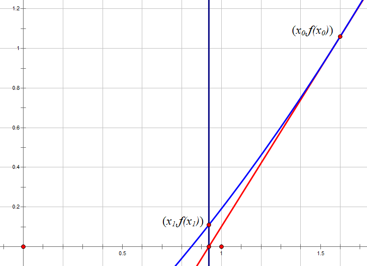 所以对于函数上的一个点 \((x_0,f(x_0))\),我们能够写出它的切线方程:\(f'(x_0)=\frac{y-f(x_0)}{x-x_0}\),这个方程与 \(x\) 轴的交点为 \((x_0-\frac{f(x_0)}{f'(x_0)},0)\),如果我们令 \(x_1=x_0-\frac{f(x_0)}{f'(x_0)}\),那么点 \((x_1,f(x_1))\) 相较于 \((x_0,f(x_0))\) 会更接近函数的零点。如图所示。浅蓝色为 \(f(x)\) 的图像。