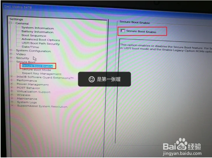 2.按照图示点开Secure Boot,选中Secure Boot Enable,在右侧取消勾选Secure Boot Enable。
