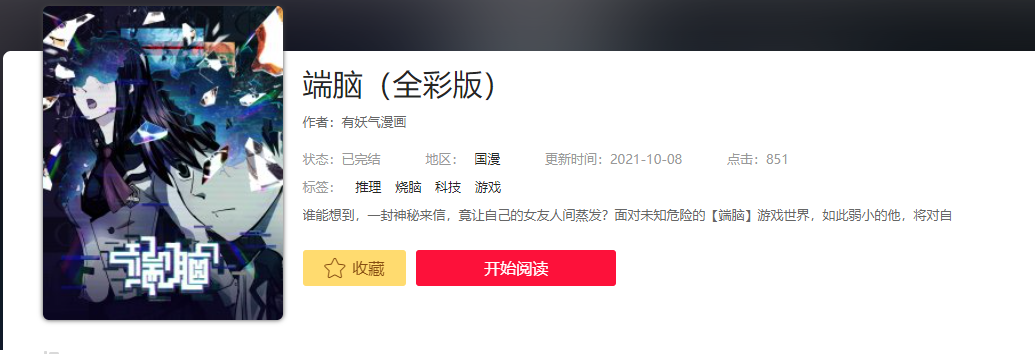 <div class="banner_detail_form"> <div class="cover"> <img src="https://img.acgzone.net/images/cover/202006/1592986867QvvH0yVfTECZ7SEi.jpg" alt="端脑(全彩版)"> </div> <div class="info"> <h1>端脑(全彩版)</h1> <p class="subtitle">作者:有妖气漫画</p> <p class="tip"> <span class="block">状态:<span>已完结</span></span> <span class="block ticai">地区:<a href="/booklist/?area=1" target="_blank">国漫</a></span> <span class="block">更新时间:2021-10-08</span> <span class="block">点击:851</span> </p> <p class="tip" style="margin-top:10px;"> <span class="block">标签: <a href="/booklist/?tag=推理" target="_blank">推理</a> <a href="/booklist/?tag=烧脑" target="_blank">烧脑</a> <a href="/booklist/?tag=科技" target="_blank">科技</a> <a href="/booklist/?tag=游戏" target="_blank">游戏</a> <a href="/booklist/?tag=" target="_blank"></a> </span> </p> <p class="content" style="position: relative;overflow : hidden;text-overflow: ellipsis;display: -webkit-box;-webkit-box-orient: vertical;"> 谁能想到,一封神秘来信,竟让自己的女友人间蒸发?面对未知危险的【端脑】游戏世界,如此弱小的他,将对自 </p> <div class="bottom" style="width: 850px;bottom: 30px;"> <a href="javascript:void(0);" id="addfavor" class="btn-1 btn_collection"><i class="icon icon-fav2"></i>收藏</a> <a href="/chapter/575710" class="btn-2">开始阅读</a> </div> </div> <script> $('#addfavor').click(function () { var val = $(this).attr('data-val'); $.post({ url:`/addfavor`, data:{'book_id' : 26027, 'val' : val }, success: function (res) { if (res.err == 1){ ShowDialog(res.msg); } else { if (res.isfavor == 1){ //表示收藏了,将控件状态改为已收藏 $('a.btn-1').html('<i class="icon icon-fav2-full"></i>已收藏</a>').attr('data-val',1).addClass('active'); ShowDialog('收藏成功'); } else { //更改为未收藏 $('a.btn-1').html('<i class="icon icon-fav2"></i>收藏</a>').attr('data-val',0).removeClass('active'); ShowDialog('取消收藏'); } } }, }) }) </script> <div style="clear: both;"></div> </div>