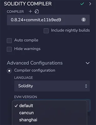 支持坎昆EVM 版本,默认Solidity 版本为0.8.24。