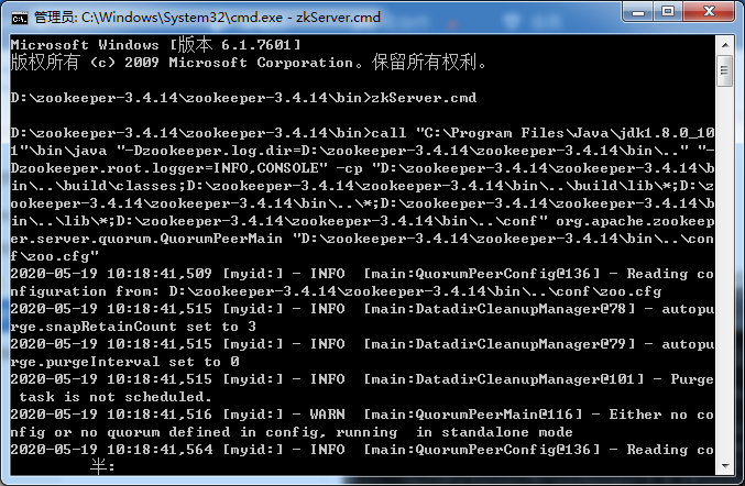 (3)cmd命令下进入安装目录下的bin目录,运行zkServer.cmd,如下图所示: