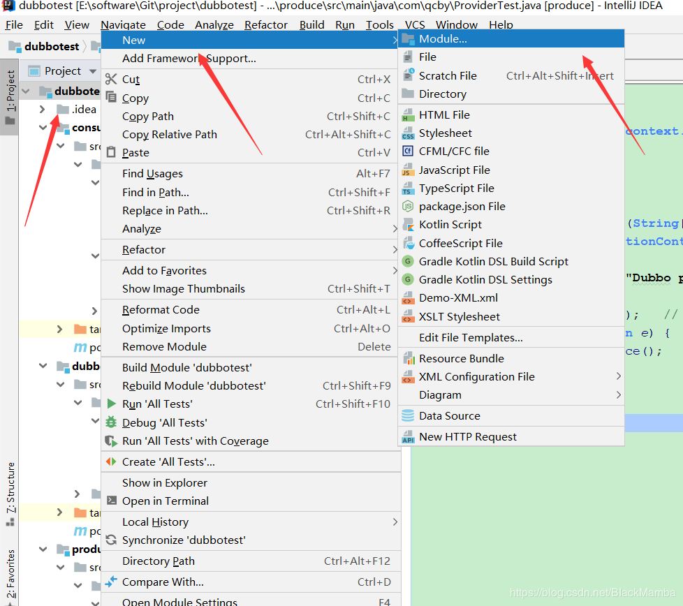 2、在父项目中分别创建common(存放接口定义或bean)、provider(服务提供者)、consumer(服务消费者)的module子项目