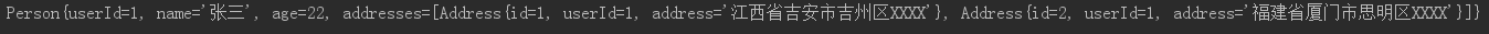 1 public class UserServiceImpl implements UserService { 2 public Person getUserAddressesByUserId(int userId) { 3 Person[] people = new Person[2]; 4 Address address1 = new Address(1,1,"江西省吉安市吉州区XXXX"); 5 Address address2 = new Address(2,1,"福建省厦门市思明区XXXX"); 6 Address address3 = new Address(3,2,"江西省南昌市青山湖区XXXX"); 7 List<Address> addressList1 = new ArrayList<Address>(); 8 addressList1.add(address1); 9 addressList1.add(address2); 10 List<Address> addressList2 = new ArrayList<Address>(); 11 addressList2.add(address3); 12 Person person1 = new Person(1,"张三",22,addressList1); 13 Person person2 = new Person(2,"李四",22,addressList2); 14 people[0] = person1; 15 people[1] = person2; 16 for (int i = 0;i < people.length;i++){ 17 if (people[i].getUserId() == userId){ 18 return people[i]; 19 } 20 } 21 return null; 22 } 23 }