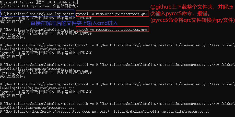 运行第一条命令pyrcc5 -o libs/resources.py resources.qrc,出现报错‘pyrcc5’ 不是内部或外部命令,也不是可运行的程序 或批处理文件。