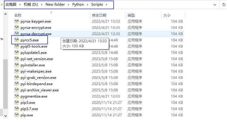 安装成功的pyrcc.exe放在以下目录中:D:\New folder\Python\Scripts\pyrcc5.exe