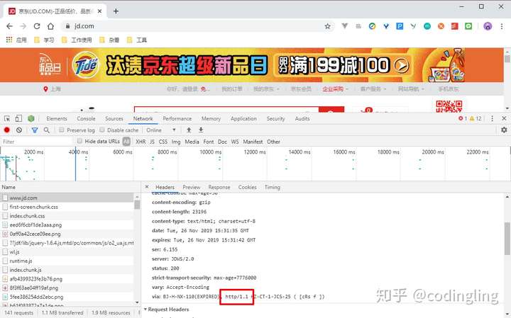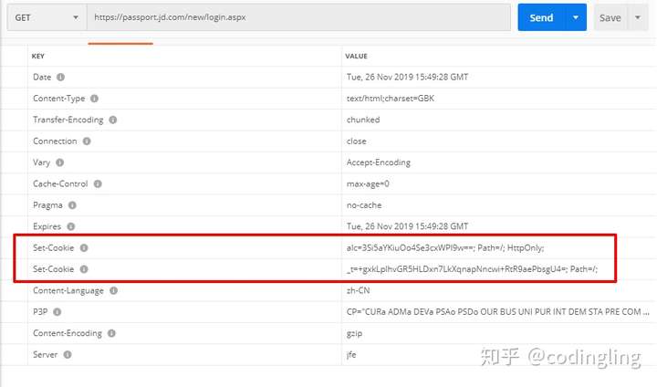 我们来使用工具 Postman 来访问下某东的登录页,看下返回的响应头: