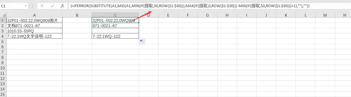 MIN(IF(提取,50,ROW($1:$30))):表示提取最小值,通过该公式可以获取到第一次出现汉字的位置。