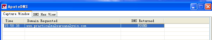 使用 ApateDNS 查看是否有 DNS 请求。发现一个对 www.practicalmalwareenalysis.com 域名的请求,这也匹配字符串查找的结果。(为了确定恶意代码是否进行额外的DNS请求,可以执行多次分析过程,查看DNS请求的变化,或者使用 ApateDNS 的 NXDOMAIN 功能 )