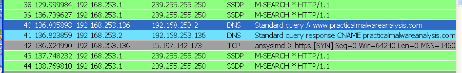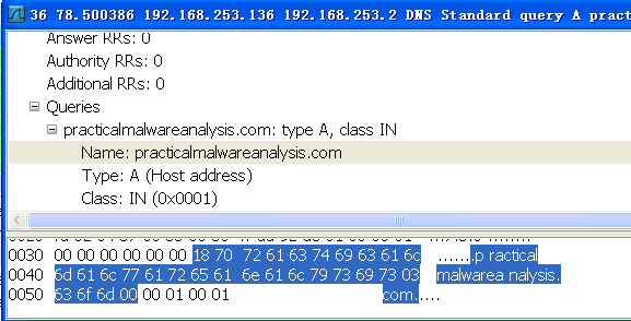 WireShark 监控中看到有DNS协议,恶意软件解析了域名www.practicalmalwareanalysis.com。