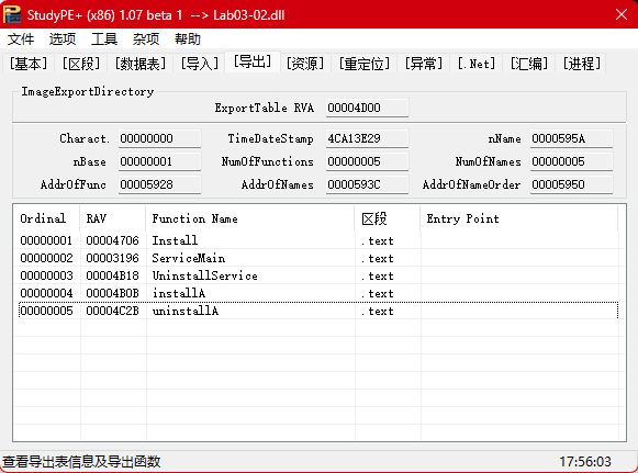 分析 DLL 的导出表,从 ServiceMain 与 UninstallService 看,此恶意代码需要安装成一个服务,使其能正常运行。
