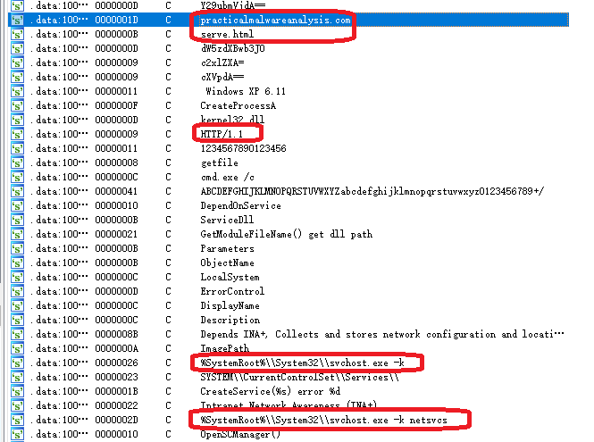 从导入表来看,包括了一些服务操作的函数;以及注册表操作函数;以及网络操作函数,表明恶意代码使用了HTTP。