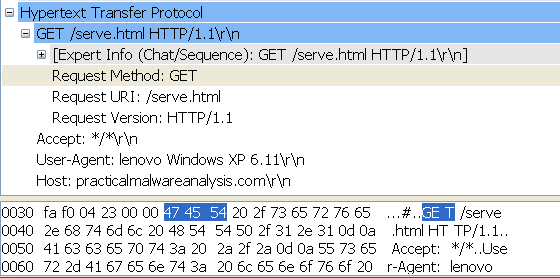 可以看到,恶意代码始终发出一个对 serve.html 的 GET 请求。