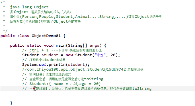- Object的toString()方法打印出的是内存地址,所以Object 的所有子类建议重写Object类的toString()方法,用来打印出该子类对象的成员信息.