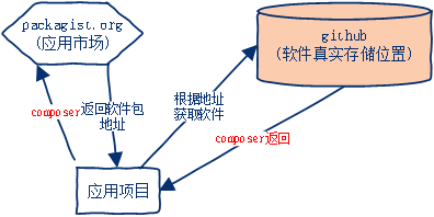 如上图,composer可以去packagist应用市场 里边下载软件,但是该市场只给返回软件的地址,对应的软件都是在github里边存储的,最终下载的软件是从github返回的。