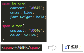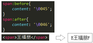 上图中,我们可以看到,可以为元素前后添加内容。这里的“内容”还可以写成unicode编码的方式,如下图: