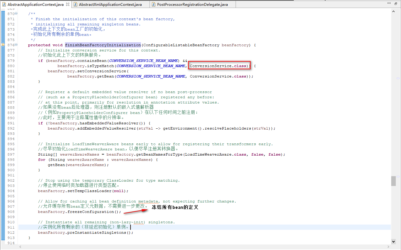 完成BeanFactory的初始化工作,其中包括ConversionService的设置、配置冻结以及非延迟加载的bean的初始化工作
