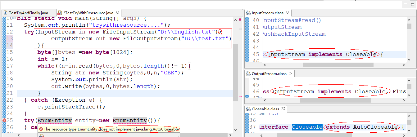 对于上面两种写法,通过多次try..catch 总能捕获到所有异常,缺点就是代码繁琐,关闭N个流,try..catch..N次,好在Java7的时候增加了try with resource语句,解决了这一问题和之前的try..catch想比就是多了一对括号,括号里面用来定义你要最终处理的类