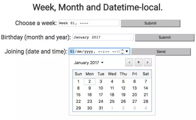 正如其名称所表明的,头两个元素可以让用户选择一个星期值和一个月份值。根据浏览器的支持情况不同,它们俩都会被渲染成一个下拉显示的日历,让你可以选择一年中一个特定的星期或者月份。