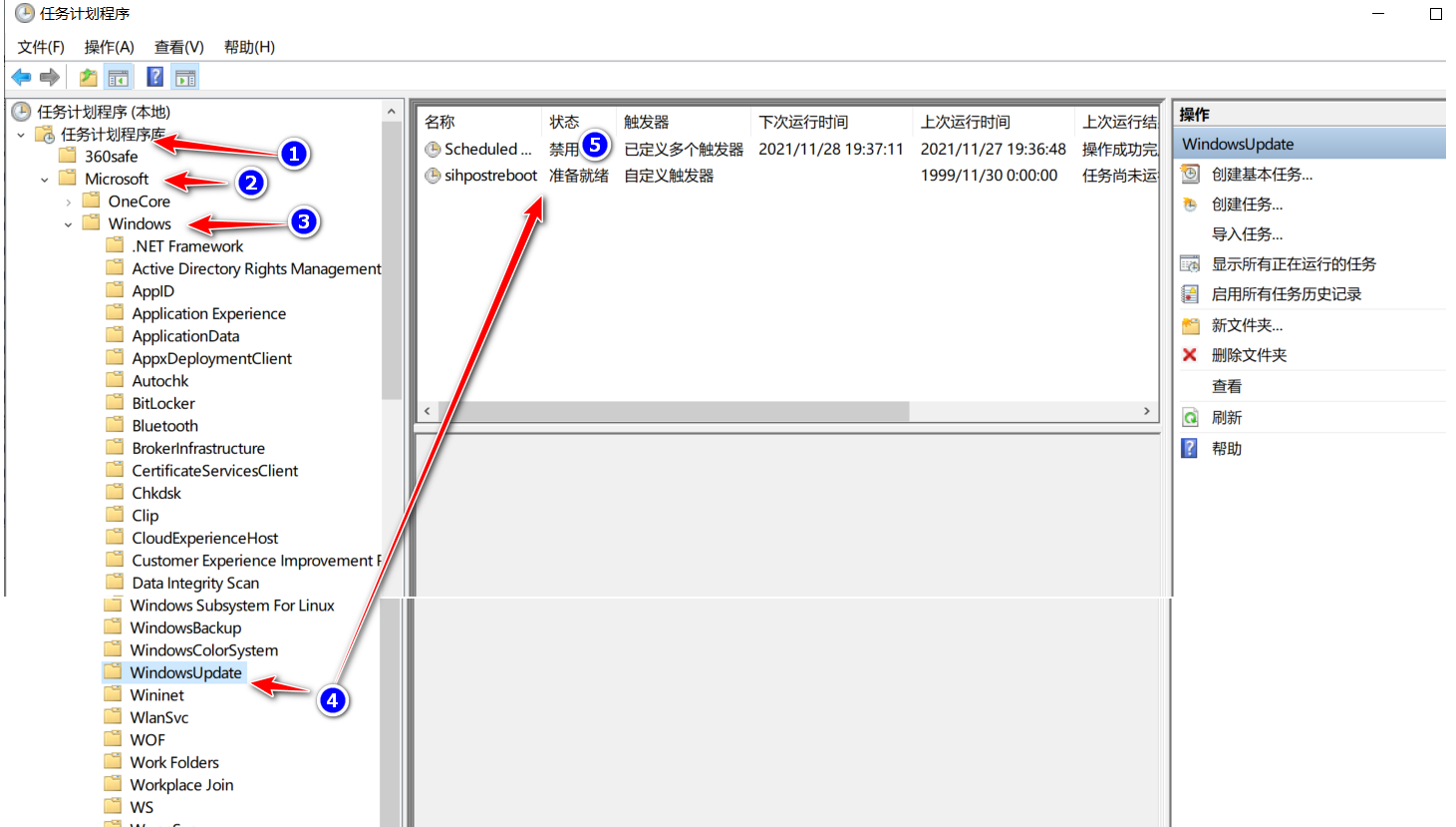 - 在任务计划程序的设置界面,依次展开 任务计划程序库 -> Microsoft -> Windows -> WindowsUpdate。把里面的项目都设置为 [ 禁用 ]。
