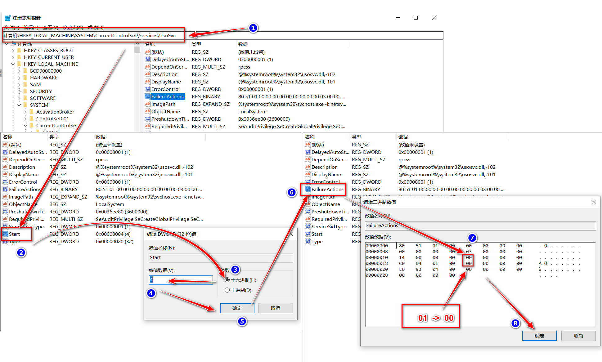 - 继续在右侧找到“FailureActions”键,右键点击修改该键的二进制数据,将“0010”、“0018”行的左起第5个数值由原来的“01”改为“00”,完成后,点击下方的“确定”即可