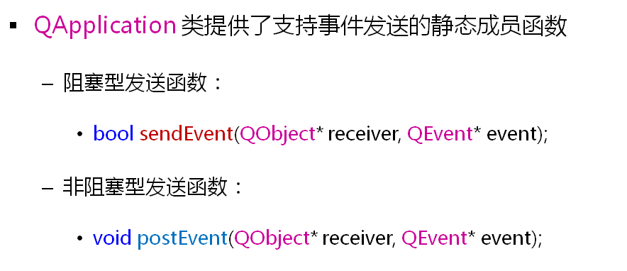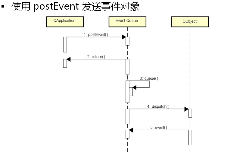 postEvent(QObject* receiver,QEvent* event) 中事件对象的生命期由Qt平台管理,它只能发送堆事件对象,事件被处理后由Qt平台销毁。