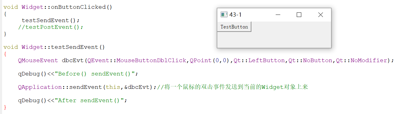 QApplication::sendEvent(this,&dbcEvt);//将一个鼠标的双击事件发送到当前的Widget对象上来