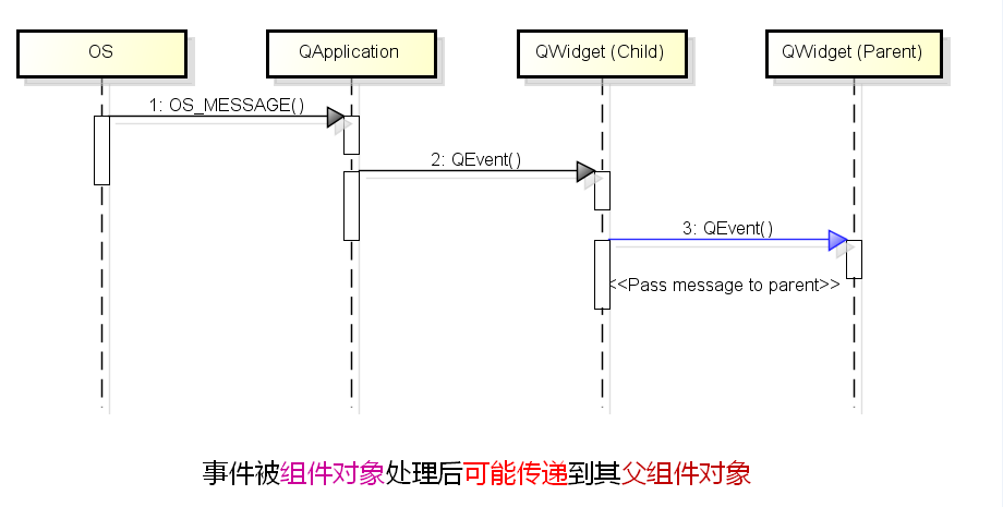 (这个就是蓝色箭头的意义,事件被组件对象处理之后,只是有可能被传递到它的父组件进行再一次的进行处理。操作系统会检测用户的各种动作,而用户的动作肯定是各不相同的,因此操作系统发送的系统消息肯定也是成百上千的,又因为每一种系统消息会被转化为QT的事件,所以对应的QT事件也是成百上千的,这就说明了这些不同的事件被处理的方式可能是不同的,没有办法用统一的方法来处理不同的事件。所以对于不同的事件必须有不同的处理方法,因此有一些事件被处理之后会被传递它的父组件进行再一次的处理,而有的事件就不会传递到它的父组件进行处理了。)