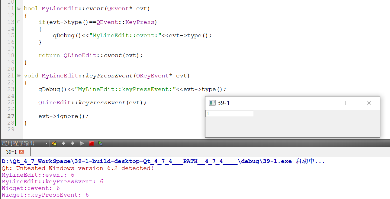 2.因为在void MyLineEdit::keyPressEvent(QKeyEvent* evt) 这个函数中调用了 evt->ignore() 函数,所以子类对象组件没有将事件处理完,将事件发送到它的父组件Widget中去了。