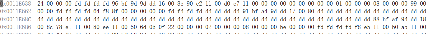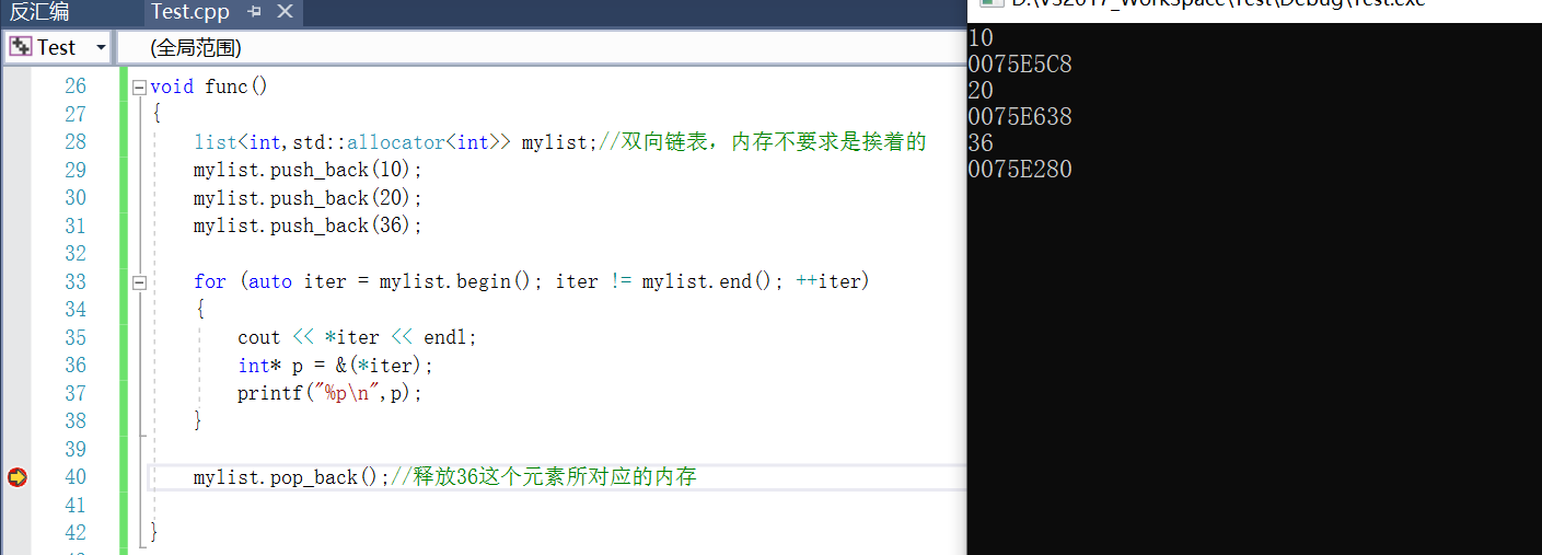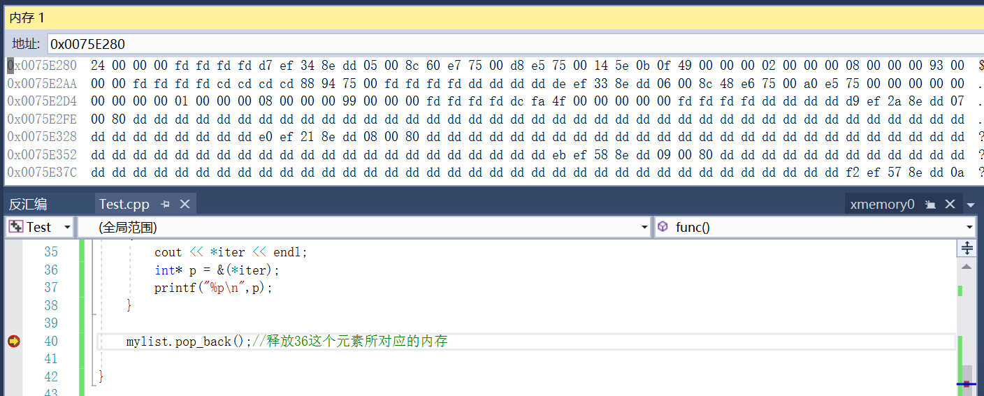 2.来看 mylist.pop_back();释放36这个元素所对应的内存,然后再次运行上述程序,把36这个元素所对应的内存地址找到,然后在VS2017下观察其释放的内存变化。如下图所示: