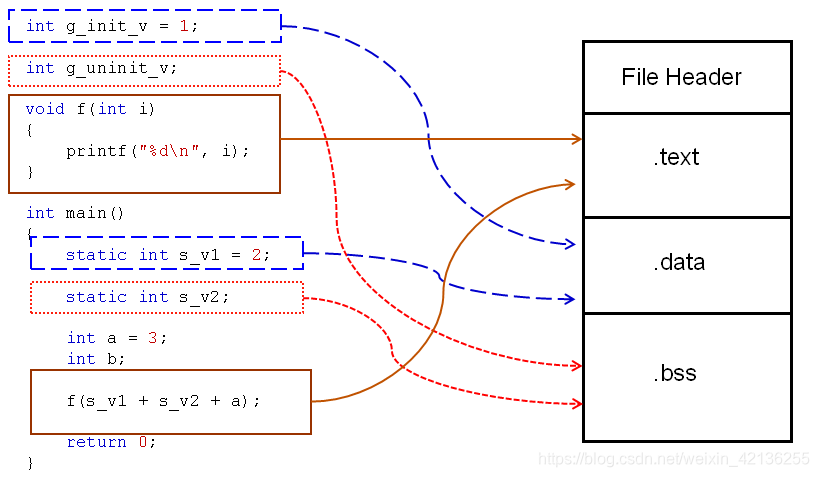 上图为不同的代码在可执行程序中对应的关系。首先观察右边是可执行程序中的各个段。观察他们之间的对应关系为:1.对于已经初始化了的全局变量和静态局部变量存放在.data段。2.对于没有初始化的全局变量和静态局部变量存放在.bss段,对于函数的声明和调用存放在.text段。是不是有一点很好奇,int a=3,int b;这2个局部变量存放在哪呢?他们是局部变量是要等到程序运行之后(变成进程)存放在栈空间上的。在可执行程序中是没有栈和堆空间的,只有等到可执行程序变成了进程之后才有栈和堆的。