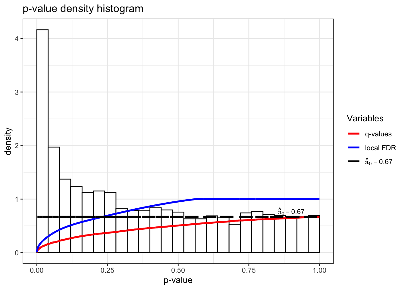 The value of \(\pi_0\) can range from 0 to 1: - A \(\pi_0\) close to 1 suggests that most of the genes tested are not differentially expressed, and the majority of the p-values are likely to arise from the null distribution. - A \(\pi_0\) much less than 1 suggests that a substantial proportion of genes are differentially expressed.