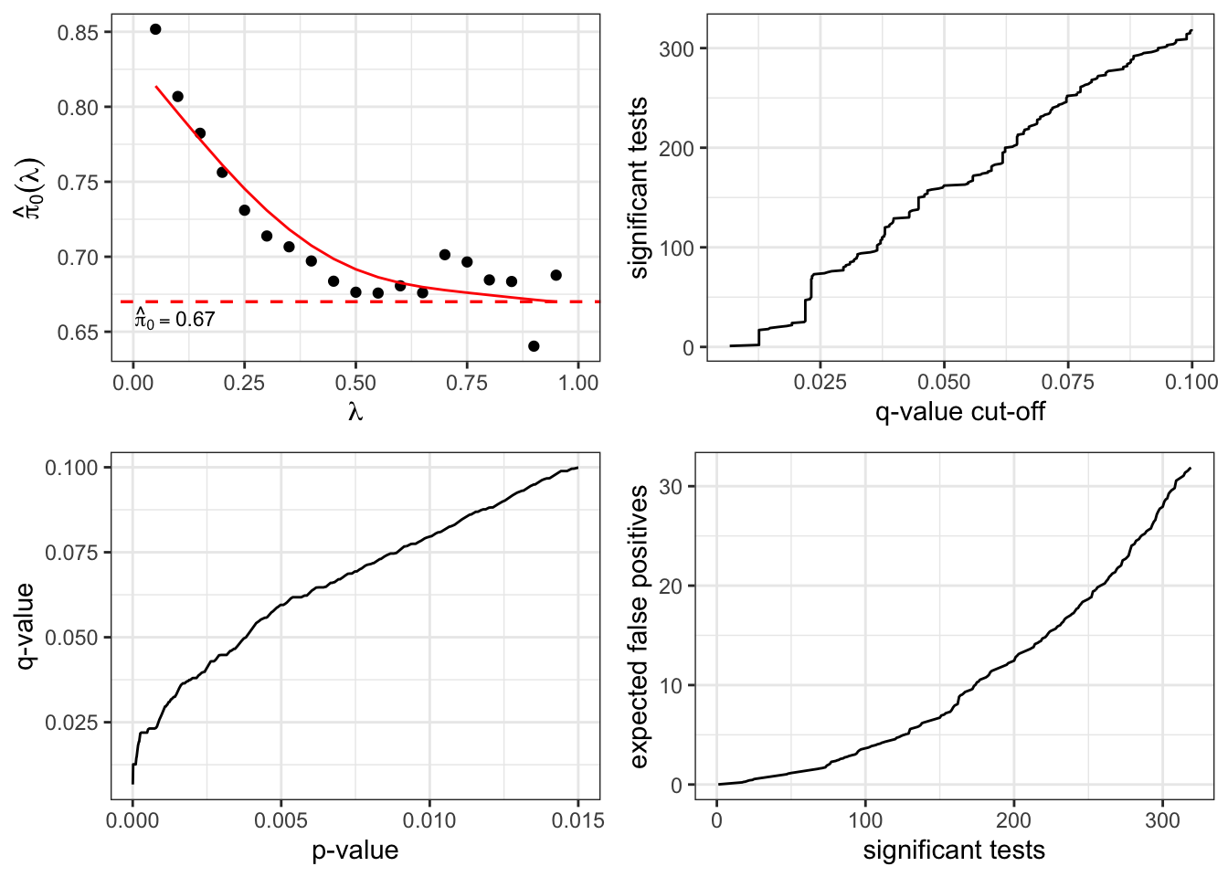 Let’s say we find that the maximum p-value for which the q-value is less than or equal to 0.05 is 3.81e-03 by running max(pvalues[qobj$qvalues <= 0.05]). This would mean that if we set our significance threshold at a p-value of 3.81e-03, the expected proportion of false discoveries, or the FDR, among the tests deemed significant would not exceed 5%.
