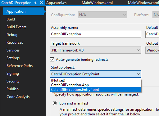这种情况我们也可以采用上面提到的第二中方法,在Main函数外面嵌套一层入口函数来判断是否存在依赖DLL,同样也需要设置Startup Object。