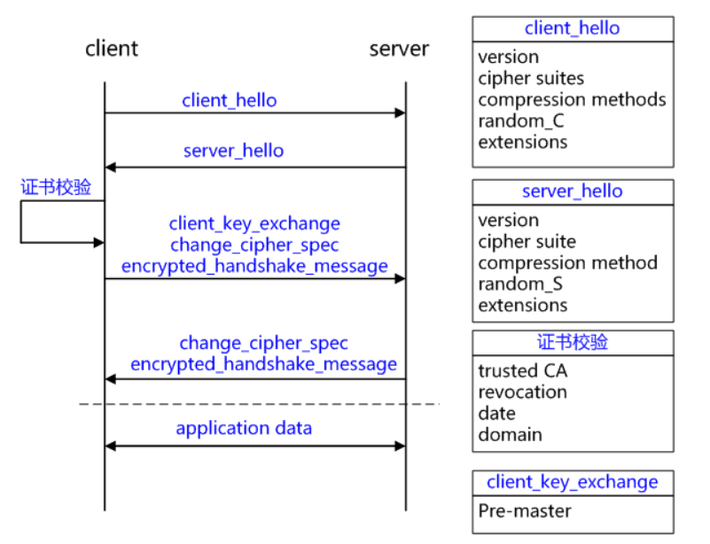 - client_key_exchange,合法性验证通过后,客户端计算随机数Pre-master,并用证书加密,发送给服务器。