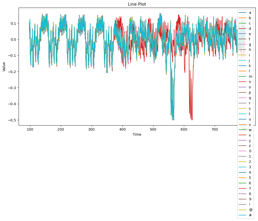 显示出600-700左右有明显的特征且只有一个字母,推测为正确的密码的一位。于是通过脚本分离