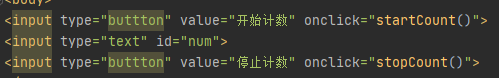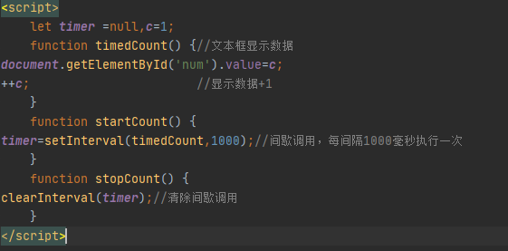 4.当用户点击“开始计数”时按钮时,调用startCount()函数,每间隔1秒(1000毫秒)调用一次timedCount()函数,并且变量c是全局变量,因此其值会被累加,实现计数效果。